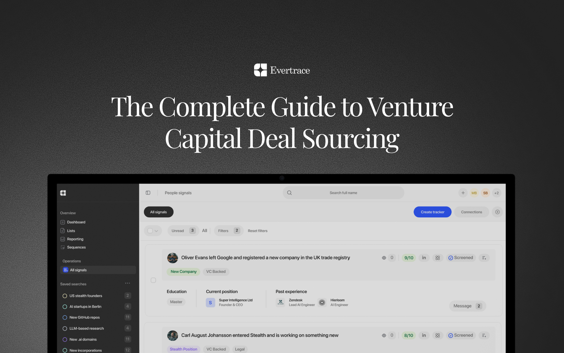 Evertrace provides the detection layer for early-stage VC funds that want to compete on timing. Real-time monitoring of trade registries, GitHub, patent databases, grant databases, academic research, domain registrations, app stores, Product Hunt, and social platforms globally produces a scored, filtered signal feed that integrates directly into Affinity, Attio, Slack, and AI agents via MCP.