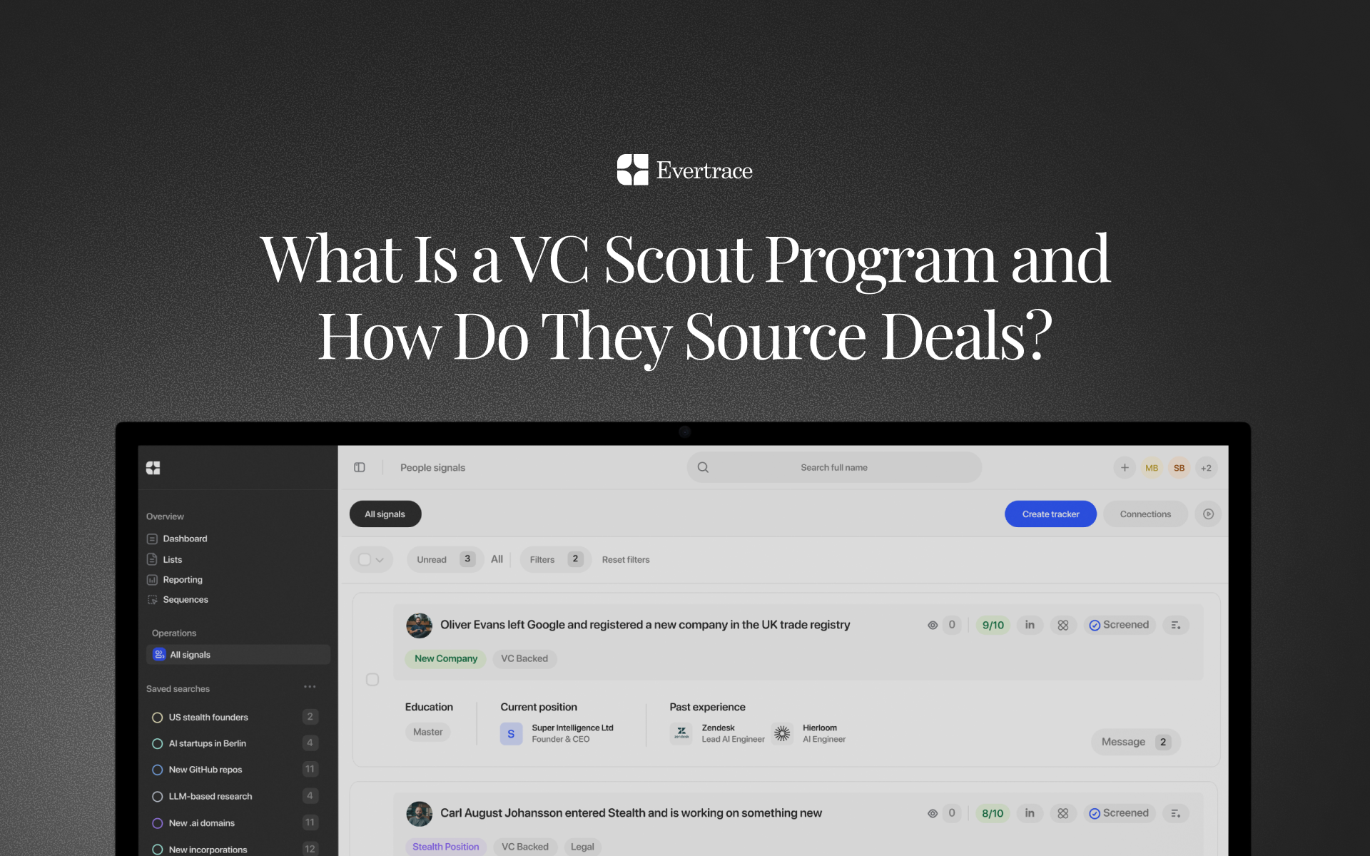 Funds that run scout programs can extend their geographic and sector coverage beyond what their scout network reaches by layering signal-based detection on top. Evertrace monitors founding activity across trade registries, GitHub, patent filings, domain registrations, academic research, and social platforms globally, surfacing founders at the formation stage regardless of whether they are in any scout's network.