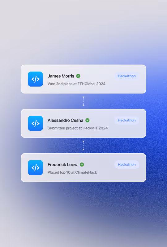 We evaluate multiple factors including winner status, repeat participation across events, team composition, and post-event activity. A single hackathon win is interesting. A winner who then registers a domain, creates a GitHub repo, and files a company is a strong